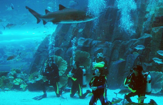 Divers- both experienced and non-experienced can plunge into the depths of this suspended tanks to have a face-to-face encounter with the world’s most extensive collection of Sand Tiger sharks.